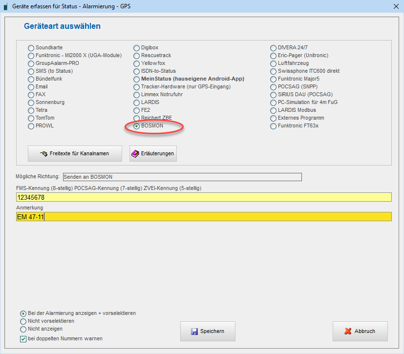 Ein Alarmtext kann an BOSMON gesendet und dort weiter verarbeitet werden. Dazu wird in ELS-Professional mindesten ein Gerät mit der Geräteart „BOSMON“ erfasst. Bei einer Alarmierung (z.B. durch Doppelklick auf das Fahrzeug, das diesem Gerät zugeteilt wurde), wird der Alarmtext auch an BOSMON übertragen. Im Menü „Schnittstellen“ BOSMON„ wird der Servername des PC eingetragen, auf dem BOSMON läuft.
