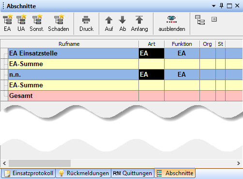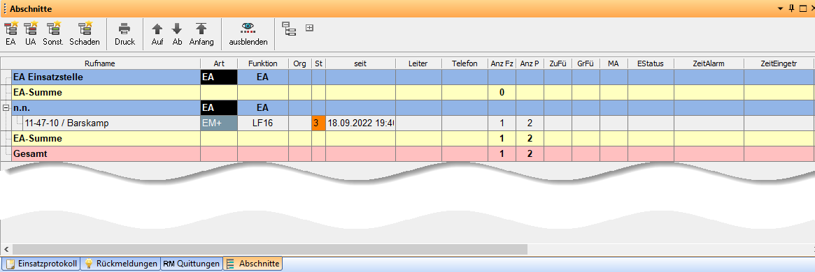 Die beiden Einsatzabschnitte "Einsatzstelle" und "n.n." werden automatisch zugefügt.