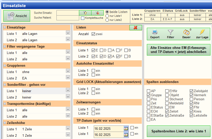 Die Einsatzliste zeigt ELS-Einsätze an.