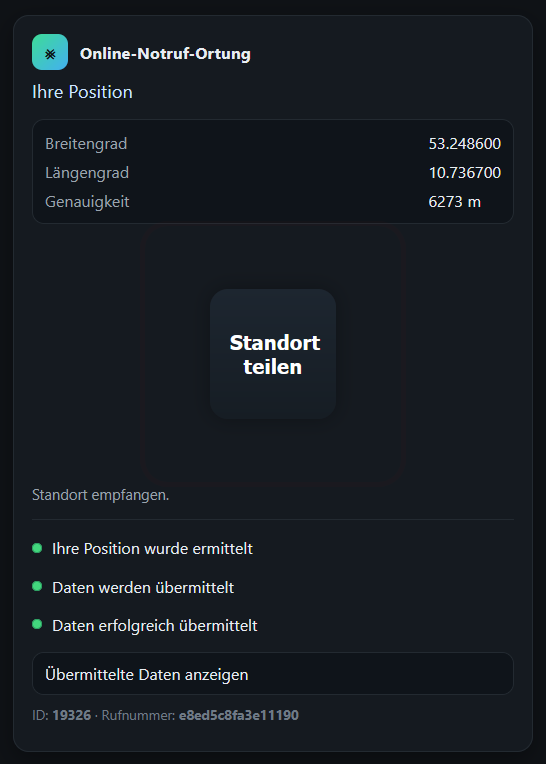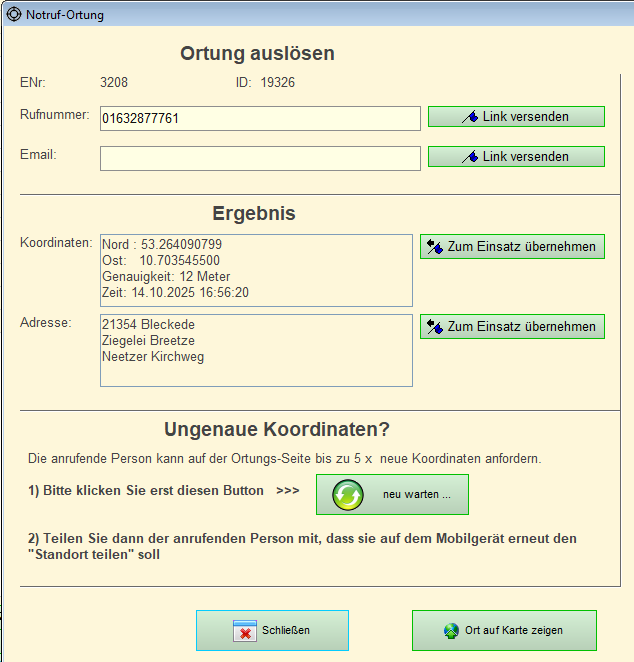 Sollten die Koordinaten zu ungenau sein (> 500 Meter oder mehr), dann kann aus ELS heraus man eine erneute Abfrage starten, ohne der anrufenden Person den Link neu zuzusenden. Denn diesen hat er ja noch verfügbar und vielleicht sogar noch geöffnet. Falls nicht, kann die anrufende Person den sleben Link jederzeit nocheinmal öffnen und den Vorgang wiederholen. Die anrufende Person muss einfach auf ihre mündliche Anforderung hin den Button "Standort teilen" nochmals drücken. Sagen sie ihm einfach: "Ihre Koordinaten sind eingetroffen. Sie sind aber etwas ungenau. Bitte drücken sie den Button <Standort teilen> jetzt noch einmal."