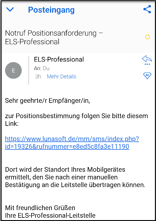 zuzusenden. Beim Öffnen des Links ermittelt das Mobiltelefon seine Koordinaten und sendet diese an ELS-Professional. Dort können sie direkt auf der Lagekarte angezeigt werden. Zum Versenden einer SMS reicht es aus, wenn ein Vertrag mit einem Anbieter besteht, der in ELS-Professional unterstützt wird und dessen Zugangsdaten erfasst sind.