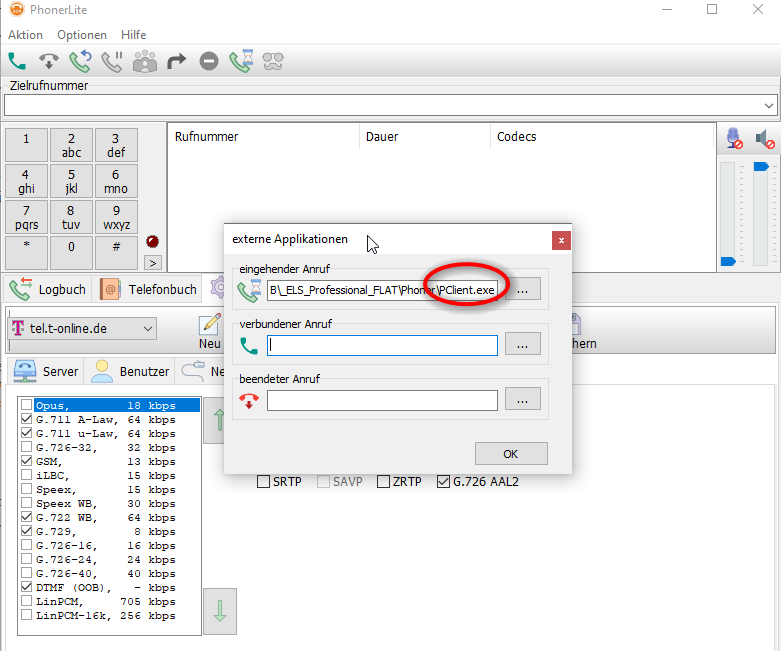 Einstellungen in ELS, damit man von von ELS aus einen Anruf einleiten kann