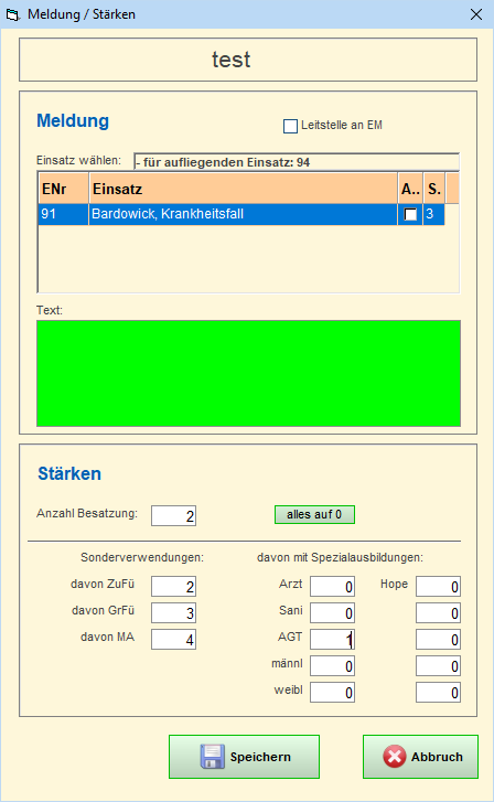 Durch Anklicken der linken Maustaste auf den Status eines Einsatzmittels öffnet sich das Stärkemeldungsfenster direkt: |