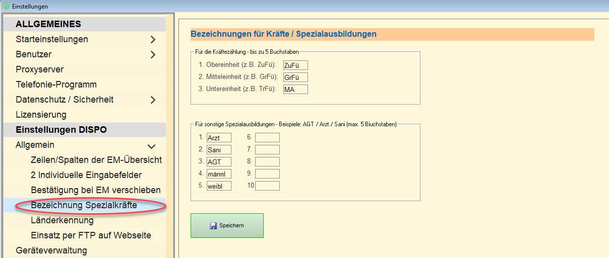 Eingestellt werden die Bezeichnungen im Menü SET -> Allgemein -> Bezeichnung Spezialkräfte: