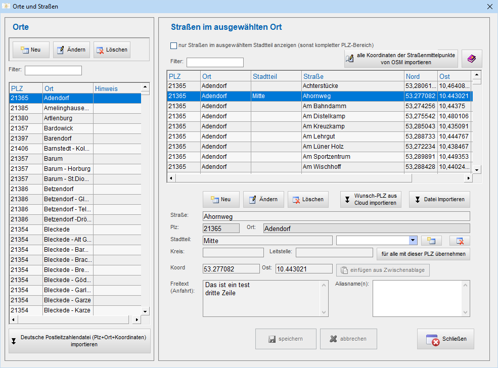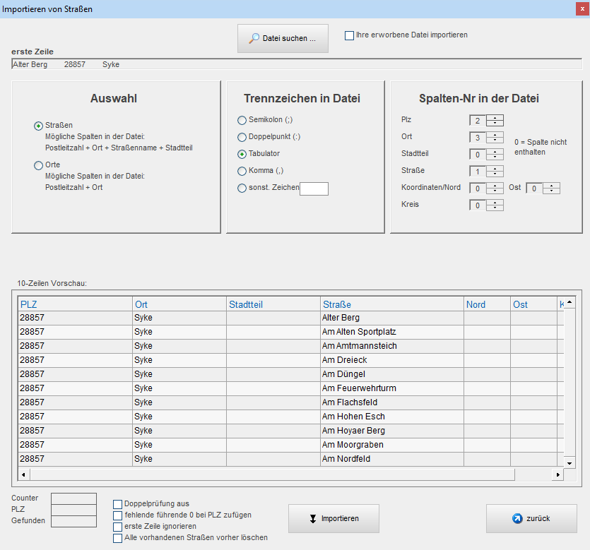 Sind Sie im Besitz einer Straßendatei, so können Sie diese ebenfalls einlesen. Das Format dieser Datei kann vielfältig sein.