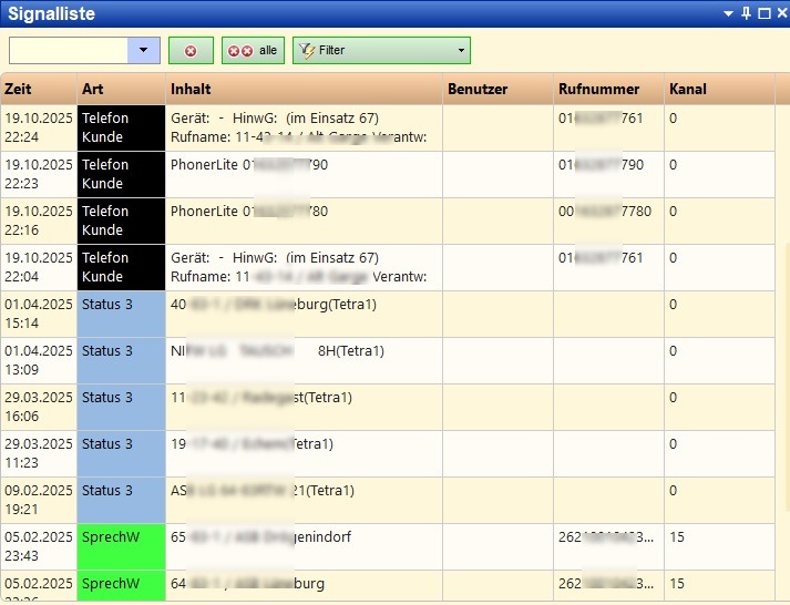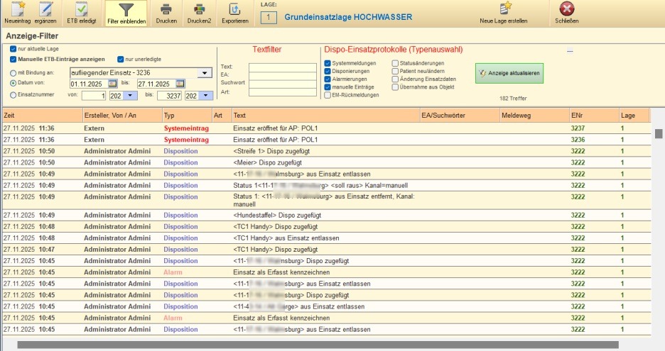 Im Einsatztagebuch werden Systemeinträge und manuelle Einträge hinterlegt. Alle Einträge sind nach bestimmten Kriterien filterbar.