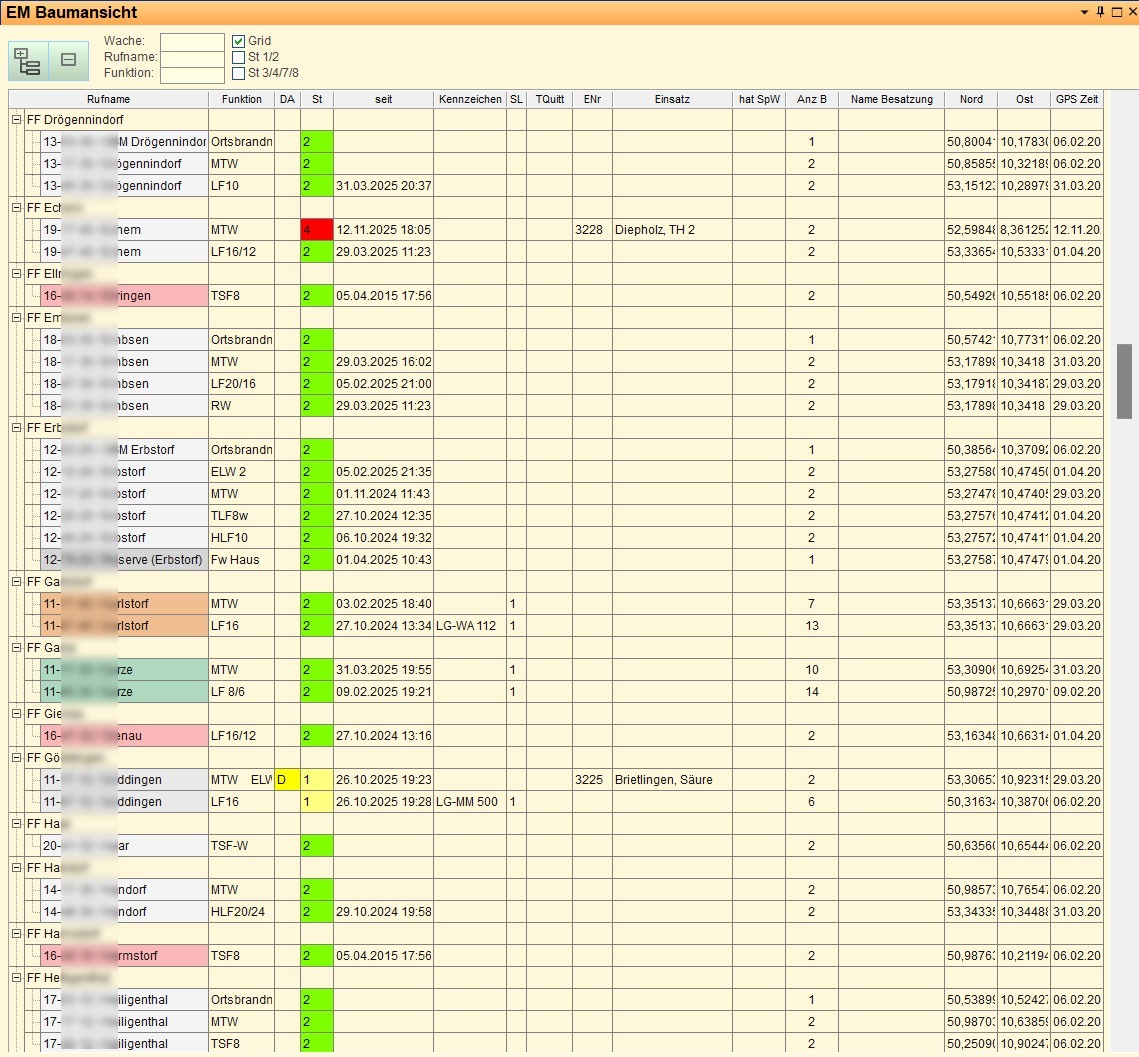 Einsatzmittelübersicht mit Anzeige der Statusinformationen, geordnet nach Dienststellen