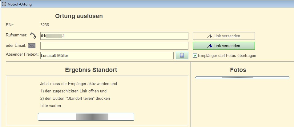 Ab der Standard-Version steht die Möglichkeit zur Verfügung, der anrufenden Person eine SMS oder Email zu senden, die einen Link zu einer Seite enthält, mit der die aktuelle Position zur Leitstelle in das ELS-Professional gesendet werden kann. Voraussetzung für die SMS ist ein durch Sie abgeschlossener Vertrag bei einem der unterstützten SMS-Provider, dessen Zugangsdaten einfach in ELS-Professional hinterlegt werden können. Der Vorgang ist denkar einfach: