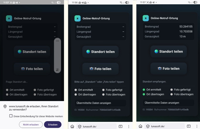 Der Anrufer öffnet den Link in der SMS und kann nun den "Standort teilen". Daraufhin werden die Koordinaten zur Leitstelle übertragen: