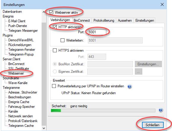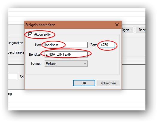 Der Benutzername „EINSATZINTERN“ und der Port „4750“ sind erforderlich