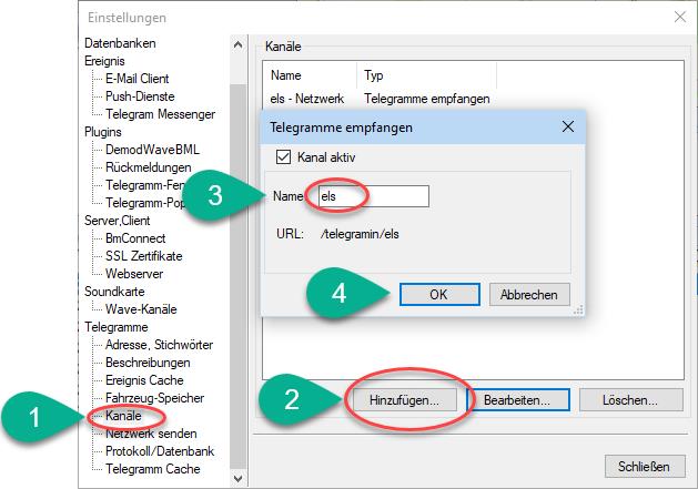 In BOSMON im Menü „Bearbeiten“ → „Telegrammereignisse“ mit dem Button „Hinzufügen“ ein neues Netzwerkereignis zufügen: