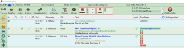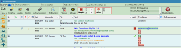 Hier hat jetzt der S2 (also ich) den Beleg 37 quittiert. „S2“ wird grün hinterlegt und der rote Botten (Zeichen dass ich noch quittieren muss) ist verschwunden.