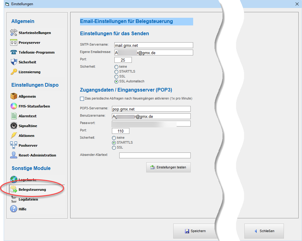 Hier stellen Sie die Zugangsdaten für das Abrufen der Emails ein: