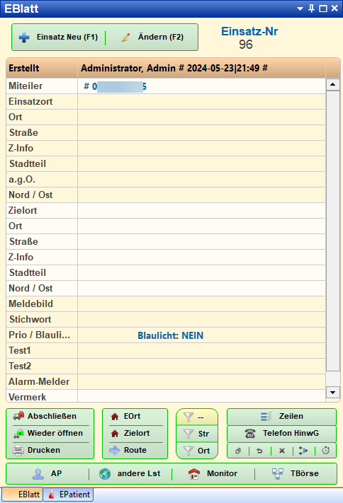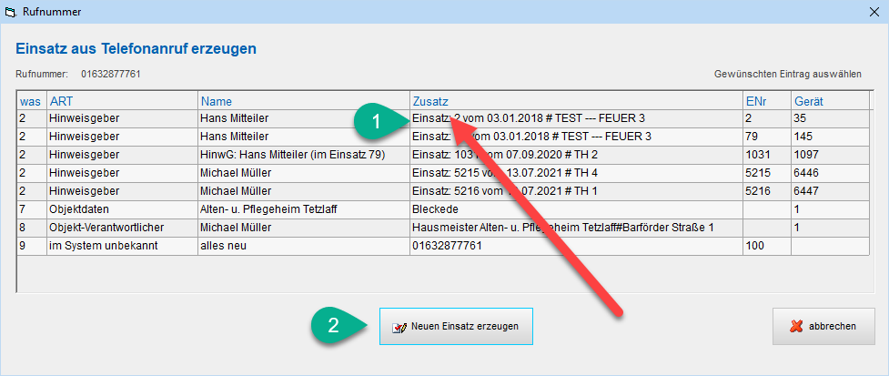 Neuer Einsatz erzeugen erzeugt einen neuen Einsatz und trägt die ausgewählten Telefon-Daten ein: