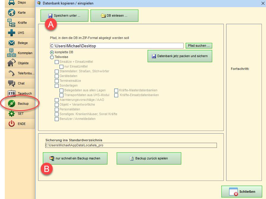 Es wird eine Datei mit dem Namen „ELS_DB.zip“ erzeugt. Diese Datei enthält die komplette Datenbank oder Teile davon und kann auf einem anderen Computer mit dem Menü „DB einlesen“ importiert werden.