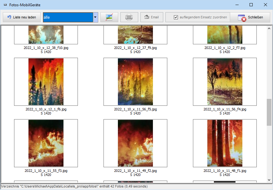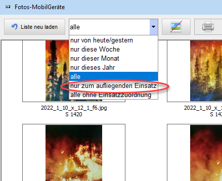 Hier können einzelne Fotos dem aufliegenden Einsatz zugeordnet werden. Wenn oben im Menü anstelle von "alle" Fotos anzeigen die Auswahl "nur zum aufliegenden Einsatz" gewählt wird, kann zwischen den offnene Einsätzen gesprungen werden und es wird immer nur das Bild /die Bilder zu desem Einsatz angezeigt.