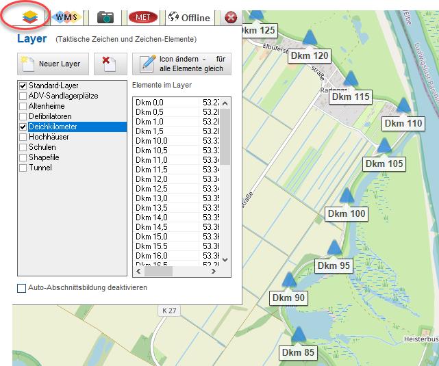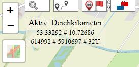 Zuerst wird der aktive Layer durch Anklicken des gewünschten Layers in der Liste ausgewählt . Er bekommt einen blauen Hintergrund. Im Bild oben ist es der Layer "Deichkilometer". Der aktive Layer wird auch oben links in der Karte angezeigt: