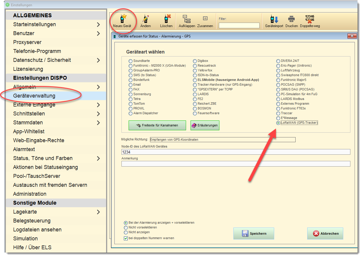 Nach Eingabe der Node-ID kann dieses Gerät einem Einsatzmittel per Drag&Drop zugeteilt werden. Mehr muss in ELS nicht eingestellt werden.