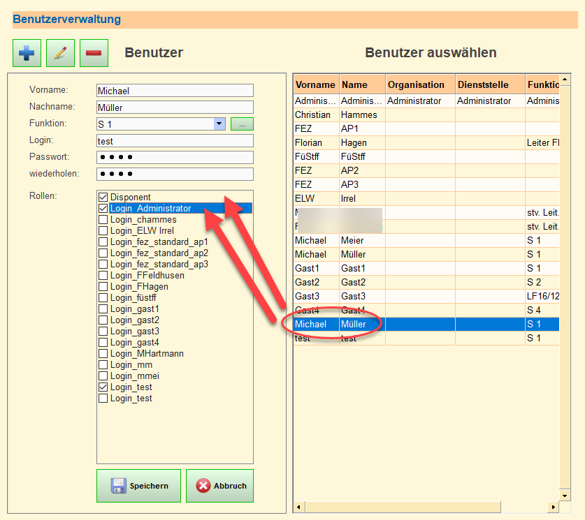 Benutzer können auch mehrere Rollen bekommen. Der Benutzer wählt sie dann bei der Anmeldung aus.