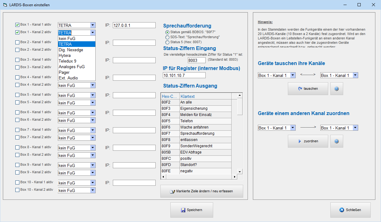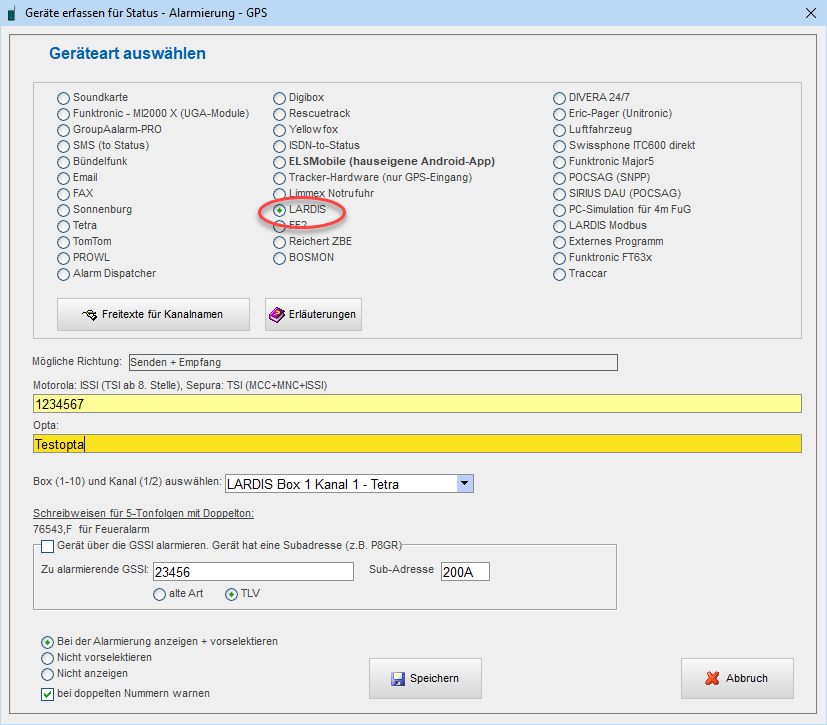 Im Wesentlichen wird hier nur die IP-Adresse Ihrer Lardis-Box im lokalen Netzwerk eingetragen sowie die Geräteart (Tetra, analoges FuG, Pager, ...)