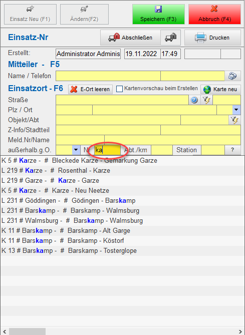 Sollte ein Mitteiler nur angeben können, zwischen welchen Orten er sich befindet, so kann dieser Ortsname bei der Einsatzerfassung in dem Feld "Nr" eingegeben werden. ELS sucht dann alle entsprechenden Straßen und bietet sie in der Autovervollständigungsliste an: