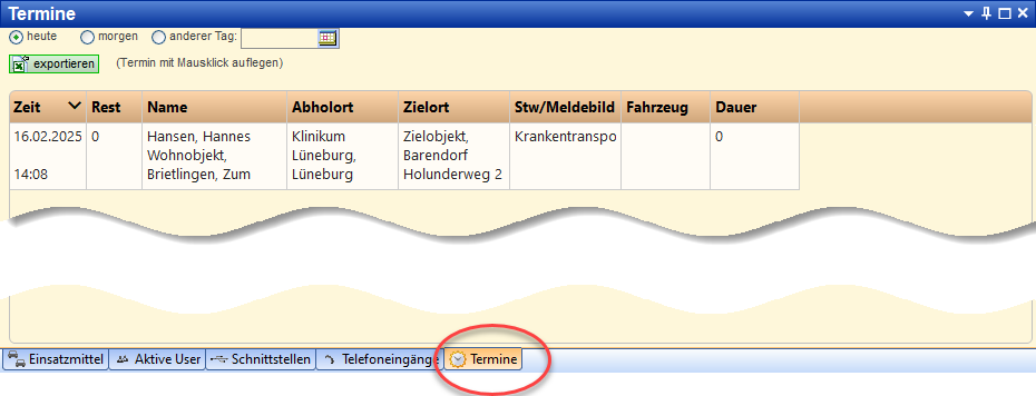 Wenn bei einer Terminfahrt zusätzlich eine Transportzeit eingetragen worden ist, wird diese Transportzeit in der Einsatzübersicht als Einsatzzeit in der Spalte „Zeit“ angezeigt.