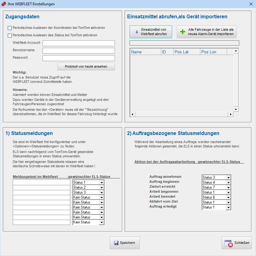 Im Menü Schnittstellen -> TomTom werden die TomTom Zugangsdaten eingetragen. Danach kann der Button <Einsatzmittel vom Webfleet abrufen> angeklickt werden.