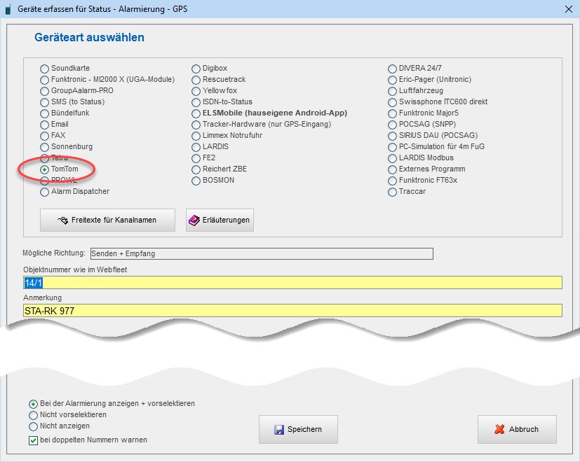 Erforderliche Einstellungen bei Stammdaten → Geräte erfassen zum Senden: